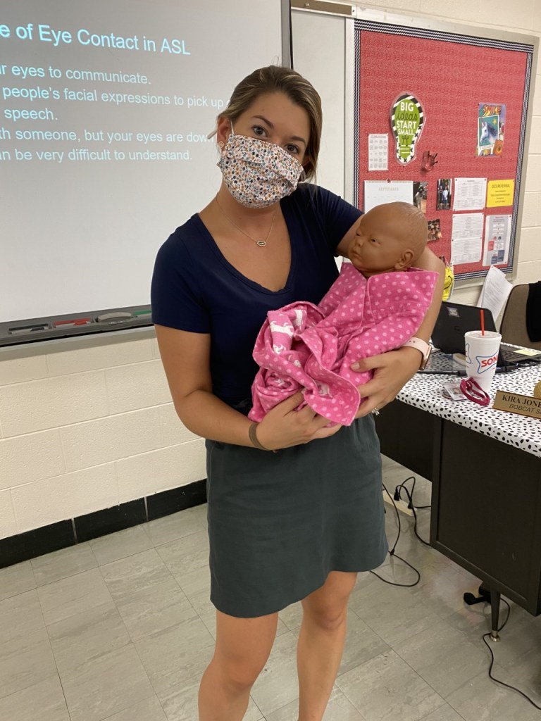 Mrs. Lawson holding a baby for Mrs. Milsap’s class.