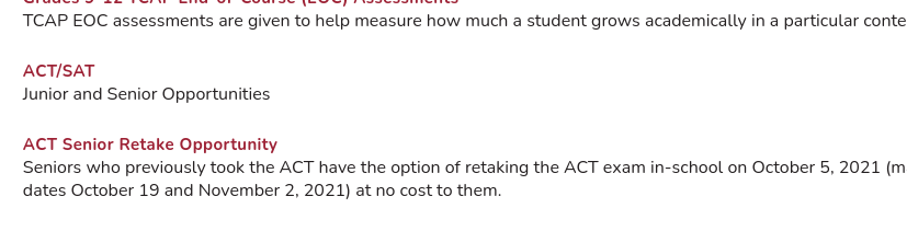 Senior retake for the ACT is scheduled on Tuesday, Oct. 5. This is an option for seniors who have already taken the ACT. Makeup dates for the senior retake are Tuesday, Oct. 19. and Tuesday Nov. 2.