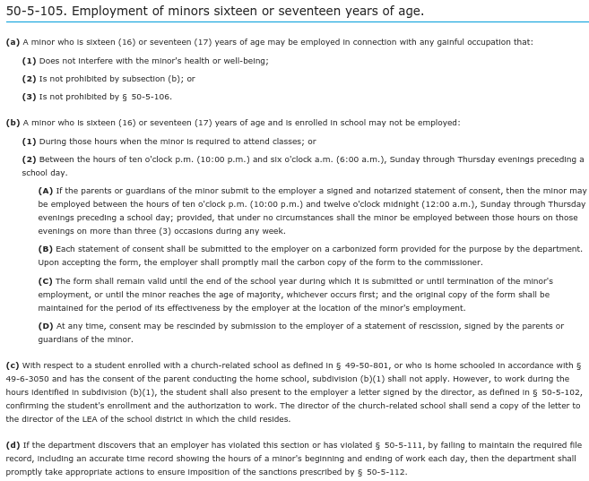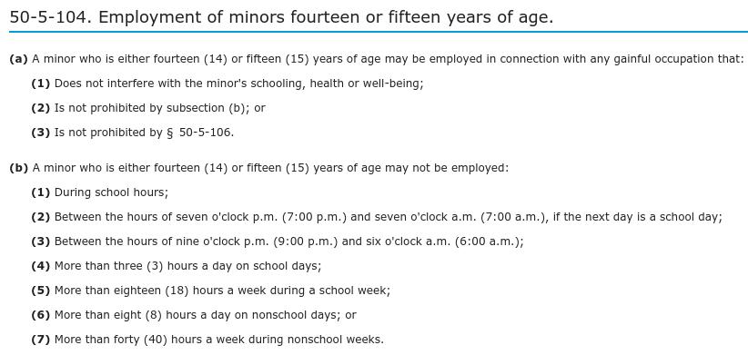 According to the Tennessee Child Labor Act, students between the ages of 14 and 15 are the youngest who can legally be employed in this state, anyone under the age of 14 is not permitted to work on payroll. Their regulations are a bit stricter than those of ages 16 and 17. The Tennessee codes for both age groups are pictured below.