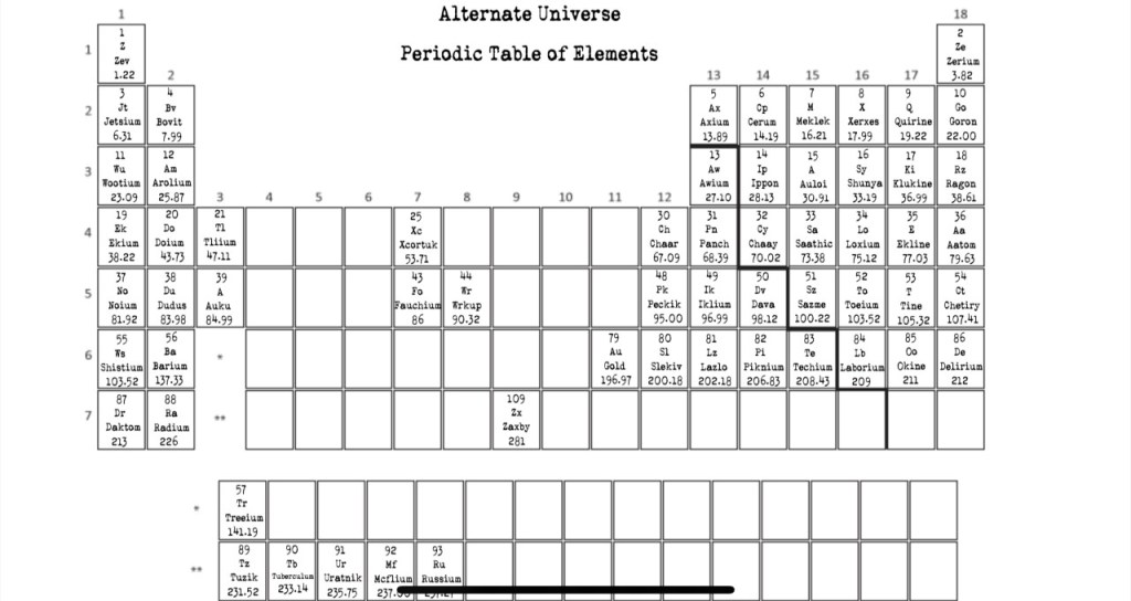 Bergstresser’s alternative periodic table consists of made-up elements. Bergstresser was the one who came up with this periodic table. When Bergstresser was making his periodic table, he said, “I made up names and made up atomic masses.” He created the table because “if you type in anything with a question on it—a test, a quiz, your homework—what is the mass of sodium or the molar mass of sodium hydride? Google will tell you instantly, but if you type in the alternate element name, it will not, so it’s to prevent cheating or to hinder cheating.”