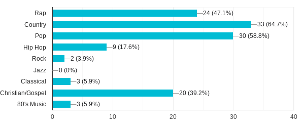 According to survey results, Country Music is Central High School’s most listened-to music genre. Pop and rap, coming in very close behind that.