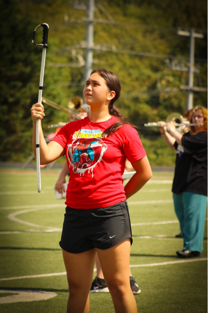 “Color guard is difficult, but takes practice just like everything else,” said freshman Anastasia Galvas. Ana has just joined the color guard this year. She’s currently on weapon line and does flag spinning. She loves weapon line, but her weakness is over the head tosses.